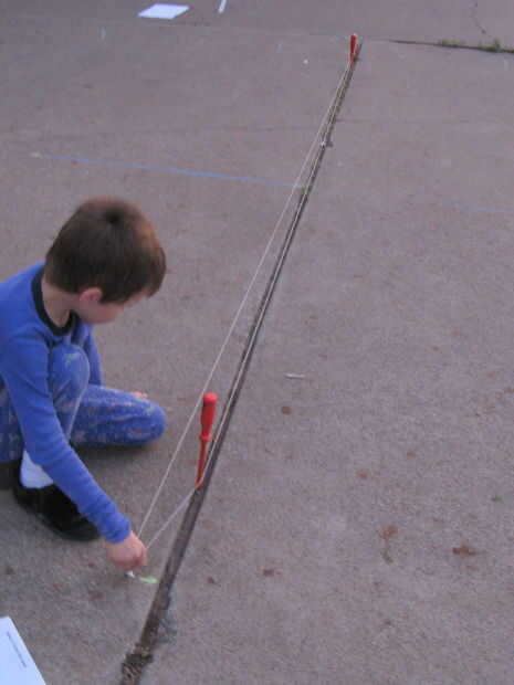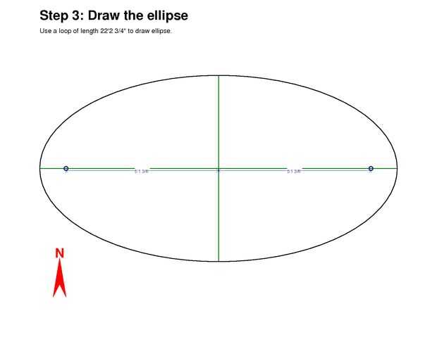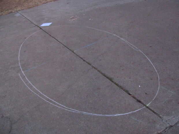 Entonces cuidadosamente dibujar la elipse, bucle alrededor del pins. (Si tienes ayudantes, podría tener que dejar de vez en cuando para que puedan moverse fuera del camino de la cuerda y vuelva a colocar los pasadores). Si haces los pasadores de inclinarse, la elipse será desequilibrada. Eso sucedió a nosotros. Pero sólo enderezar los pines, ir sobre los segmentos mal otra vez correctamente y cuando todo haya terminado, borrar los errores con un trapo húmedo. La segunda foto muestra estos errores, pero eran fáciles de borrar.