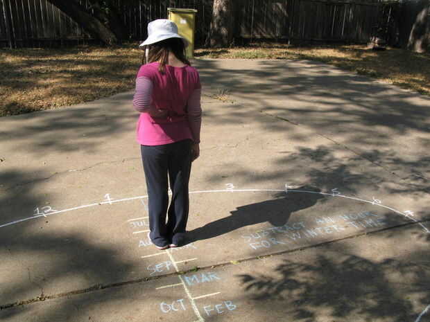 Si el reloj de sol es lo suficientemente grande como para que una persona puede actuar como gnomon, acaba de poner a sus pies a cada lado del eje norte-sur del reloj de sol, con las piernas (no pies--tu stick pies hacia fuera delantero de las piernas!) centrado en la fecha correcta. Entonces leer la hora en el centro de donde la sombra de su cuerpo golpea la elipse. Si la persona es demasiado corta para su sombra para llegar a la elipse en un momento dado, sólo Imagínese extendiendo la línea de su cuerpo hasta que alcanza la elipse o se sostenga sus manos se unieron por encima de su cabeza.