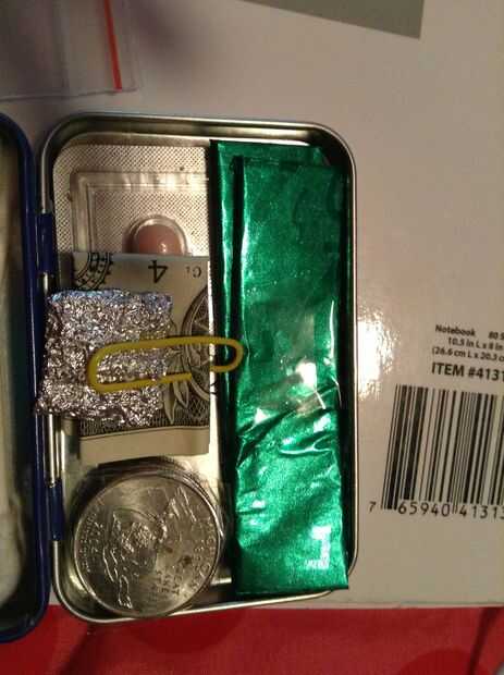 Quería algo pequeño que puede hacer un fuego, una fuente de luz, una lámina, con información de contacto (puede doblar como combustible para el fuego), pastillas y alguna cinta.Paso 1: Lo que está dentro Hay un metro de cinta aislante que envuelve el