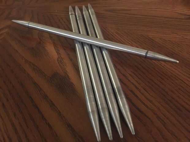Mi hija se ha convertido en un ávido calcetero. A ella le gusta un estilo 5 aguja. Mientras que la mayoría de las agujas de tamaño están disponibles en madera y metal, ella quería probar las agujas de 9mm y sólo pudo encontrar en madera. Saber que disfruto de un desafío, ella pidió un conjunto en metal. Aluminio fue la elección obvia para el peso.