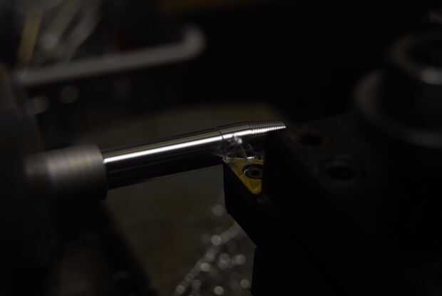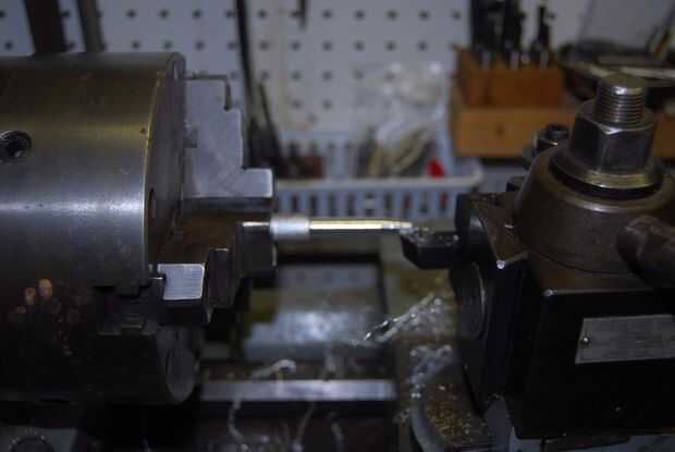 Para la mayoría de los extremos, usé algunos barra de aluminio de 3/8" que tuve (0,375" ó 9.5 mm). Desde que tuve un 3/8" recoger para mi torno, pude sujetar firmemente con la longitud de la varilla que pasa por mi cabeza. Esto me permitió hacer los conos de la barra sin ningún desperdicio. En las fotos, he utilizado una varilla de diámetro mayor por lo que necesitaba bajar más y usar mi mandril de 3 mordazas.