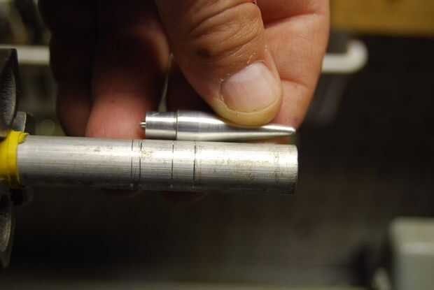 Marque la longitud total del cono más el trozo que se utiliza para pegar en su lugar en mi barra. Eso sería sobre una longitud total de 1.5". Para metales blandos uso una pinza barata como un medidor de la marca (yo nunca haría esto con mis pinzas buena pero tener alguna carga puerto pinzas $8 ha algunas ventajas). Dio vuelta el diámetro de esta longitud de hasta 9 mm, tratando de ser bastante precisa en la sección media y haciendo una luz final pasan a una velocidad de avance lento para conseguir un acabado tan bueno como sea posible.