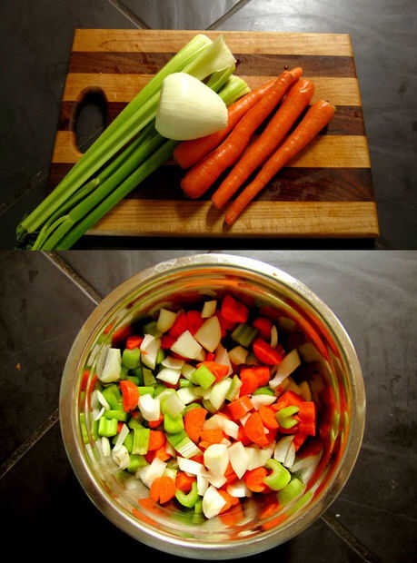 Mientras que los huesos son hervir a fuego lento, preparar el mirepoix, que es francés para picado encima de cebolla, apio y zanahorias. Sólo los pique en 1/2" piezas. Cuanto más uniformemente está corte más uniformemente que se cocinarán, pero no tirón una regla o cualquier cosa. Después de 4 a 5 horas los tejidos conectivos se rompe bastante abajo. Ahora usted puede poner en las verduras y cocer durante una hora. Si quieres poner en cualquier hierbas como laurel, tomillo o lo que quiera ahora sería el momento. Si quieres ser elegante, atar en un paquete con un cordón de algodón y colocar su bolsita en. Generalmente no añadir hierbas. Quiero una base que puedo tomar en cualquier dirección más adelante.