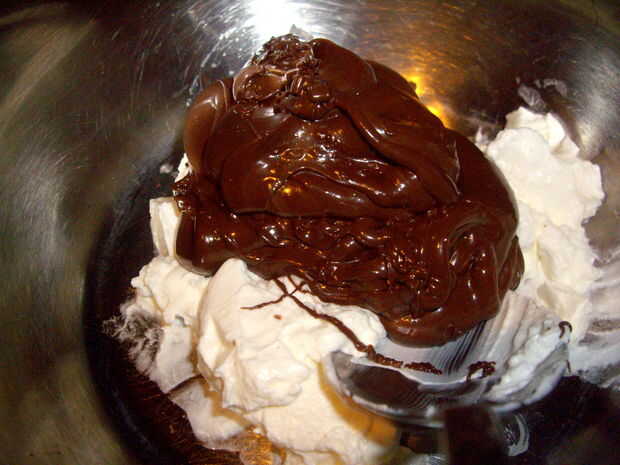 Separar el marrón chocolate en dos partes y uno de él la mezcla con la crema en un bol.
