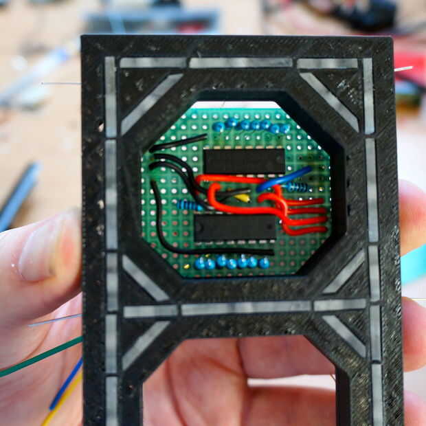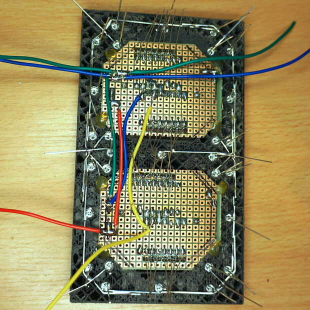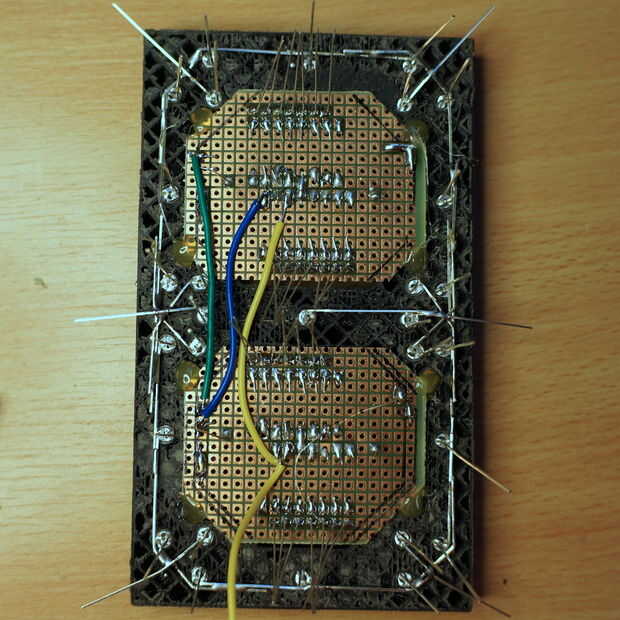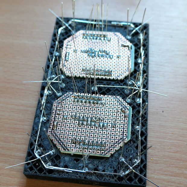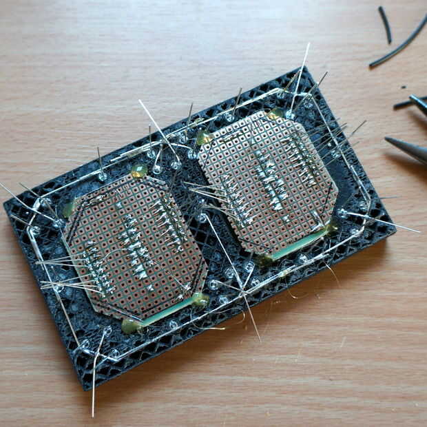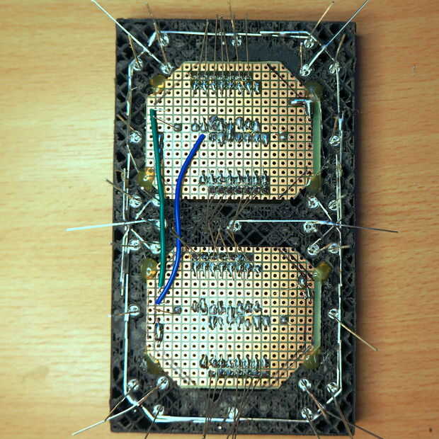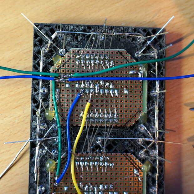 • soldar un cable (azul) del perno de IC aún no conectado en la placa superior al cable azul (en la parte delantera) de la parte inferior de PCB