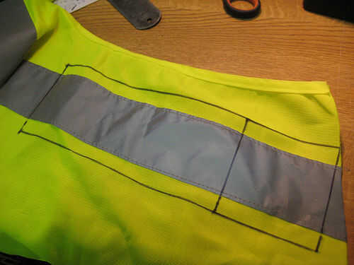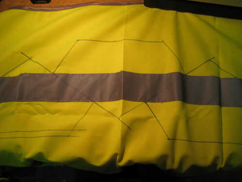 Marcando es la más delicada, ya que uno tiene que evaluar cuál es la mejor para cortar el chaleco. No hay ninguna fórmula real para esto, tratar de hacer uso de la malla y la tira reflexiva ya que es tal que el número mínimo de cortes y juntas se requieren. Elaborar la mejor estrategia en el papel dibujando líneas para las juntas. Tienes que añadir 10mm alrededor de los bordes para las costuras. Medir las dimensiones, añadir en tu 10mm y marque en el chaleco usando una lápiz/tiza y una regla y Plaza.