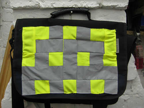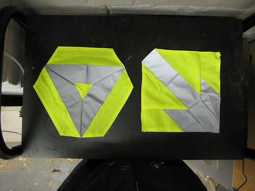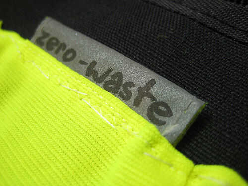 Pin en la tarjeta o velcro tiras y un pespuntes o una puntada en zig zag corriente alrededor del borde. Asegúrese de atar firmemente. Ahora es el momento para agregar una etiqueta si lo desea, que se ve muy bien en el material de tira gris reflectante (ver foto). Para la opción del velcro, el método es igual, pero sólo coser el velcro lazo.