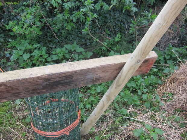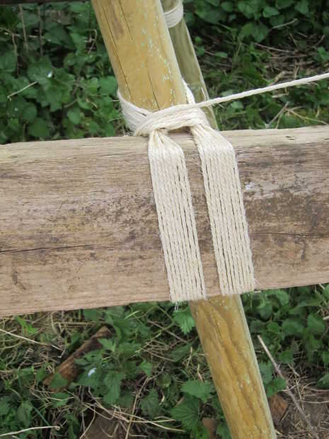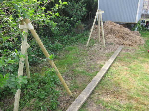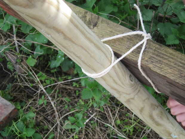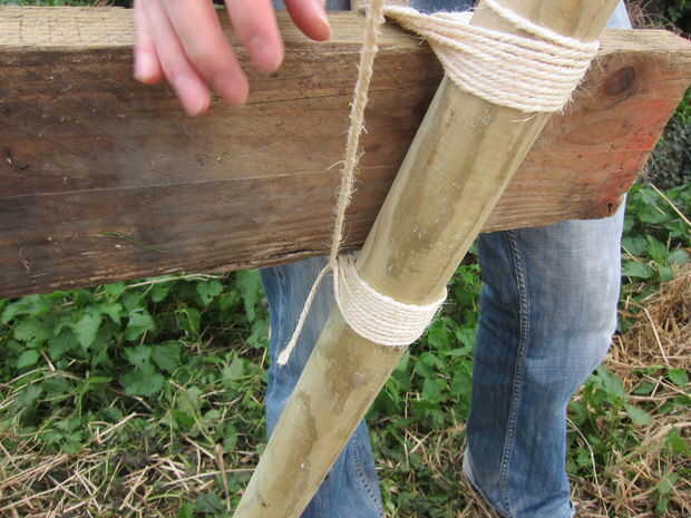 A continuación ponemos los trípodes en sobre la distancia de los postes largos. El polo largo debe superponerse a cada lado para que nos los podemos latigazo al trípode. A continuación encontrar algun apoyo para poner el polo en (o tener una mano amiga) y use una escuadra de sujeción para fijarlo. Para la altura, sólo asegúrese de que todavía se puede llegar más fácilmente y que tenga cierta altura en el paso siguiente.