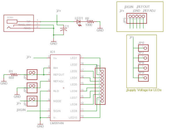 Si usted toma una mirada en mi esquema, puedes ver que usar tres puentes. Yo quería hacer este diseño flexible en caso de que quería cambiar mi tensión de referencia o el modo de la barra de luces. Si se saltaban JP2 y JP1, permite la tensión de referencia a la 1.25V generada el LM3914 y el segmento actual es controlado por R1. Si se desea un voltaje de referencia diferente, se dejan los puentes y la tensión se puede establecer con un circuito externo cableado a los terminales REFOUT, REFADJ y tierra (consulte la hoja de datos para ver cómo funciona). Puente JP3 coloca el controlador en modo gráfico, ninguÌ n puente establece en modo de punto. Tengo cableado de RLo (referencia bajo) a la tierra, pero ahora pienso que debo haber hecho una opción demasiado. Sugiero breadboarding primero para asegurarse de que todo se ve bien antes de continuar. Tenga en mente, el LM3914 está hundiendo la corriente, no suministra la V + a los LEDs. El lado del cátodo va al controlador y el V + está conectado hacia el ánodo. Para comprobar el funcionamiento, puede utilizar un potenciómetro. Con JP1, 2, 3 puente, puede conectar un lado de la maceta a GND, el otro REFOUT y el limpiador de la olla a la SIGIN. Al girar el bote, debe ajustar la tensión en el perno de la entrada y la luz encima de los segmentos por consiguiente.