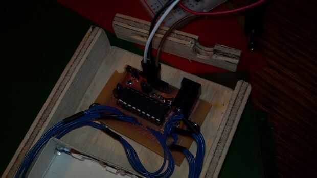Para un recinto, usé una pequeña hoja de madera contrachapada de 1/4. Asegúrese de dejar espacio para los cables de la ruta, medir todo para arriba y cortar los lados de la caja, todos menos uno para el frente. Se desea que el borde de la caja a ras con la parte superior de los reflectores una vez se colocan dentro. Tendrás que colocar la Junta en el recinto y marca donde van los cables de potencia y control para entrar. Me mina clavados juntos y le dio un tiro rápido de pintura en aerosol negro. Una vez hecho esto, puede organizar su tablero de control y pegue los reflectores en el lugar.