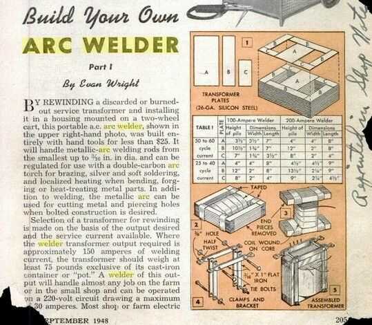 Este es uno de un par de soldadoras de arco de Popular Mechanics que se puede construir. El otro es de la edición de noviembre de 1955 (p. 207). Es un artículo de una sola pieza--ninguna continuación en el próximo número.