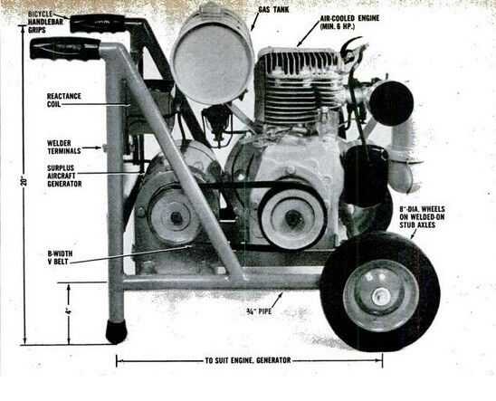 La de noviembre de 1965La revista Popular Science realizaron un artículo para un soldador de arco portátil construido a partir de un motor de gasolina y un generador de avión militar de sobra.  Es un soldador de la C.C. con un estabilizador de arco.  Su salida es cerca de 75 amps., que es adecuado para soldadura de varilla de 3/32 pulgada.