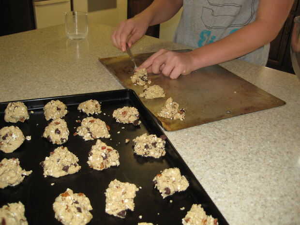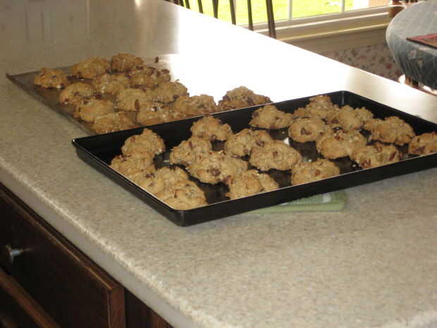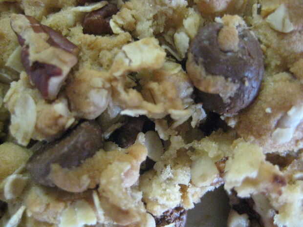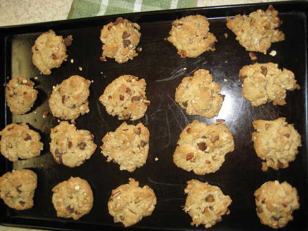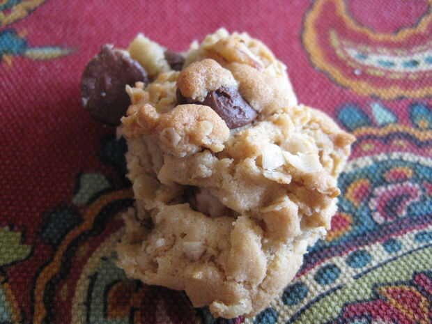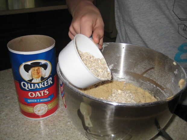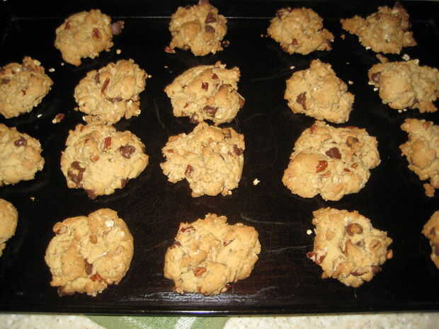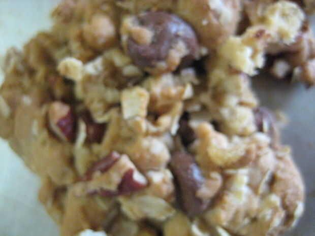 Combinar el azúcar y la manteca, batir bien; batir huevo y vainilla. Agregue la mezcla de harina y mezclar bien. Agregue el avena, bocados de chocolate y nueces.