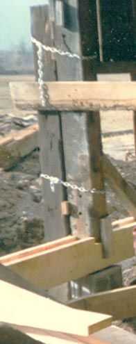 Los anteriores propietarios habían sido buenos lo suficiente como para dejar varios lazos de ferrocarril sólido. Descubrí que si he usado un montón de pequeños tramos de cadena y algún bloqueo y soportes pude conocer esos requisitos. Como el cuadro demuestra que el lazo del ferrocarril es encadenado a la post, la forma es en lugar y listo para barras de refuerzo y hormigón a bombear en. El bloque está allí como medida de seguridad hasta que el concreto fue vertido.
