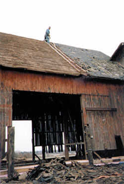 Una vez que el hormigón había fijado y hemos limpiado todo el heno ponerse de nuevo en el granero para aislar el concreto de la congelación. Empecé en el marco de reparar y enderezar el edificio, cortar a través los clavos viejos que los frenillos en y uso pesado viene-coro tirado el edificio hasta que fue casi recto, sería imposible conseguir perfectamente recta porque algunos de los puestos tenían un toque bastante bueno para ellos. Con realiza y el umbral de nuevas placas todos atornillados. Empecé en varias capas de cubierta en un lado y el techo de acero muy pesado calibre que había sido instalado en el lado oeste del edificio (la única razón que estaba en tan buenas condiciones). Para hacer esto tuve que tomar una vieja escalera de madera de cuarenta pies y brazos del perno a él cuelguen demasiado el pico de la azotea. La cancha de 12 x 12 era demasiado escarpada para caminar en y las viejas tejas habría resbalado fuera de todos modos, yo con ellos.