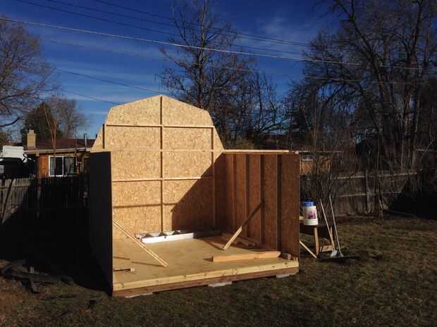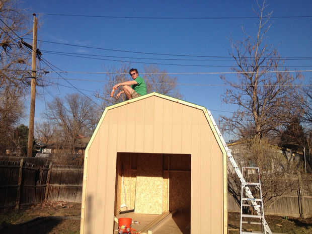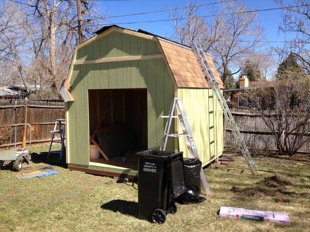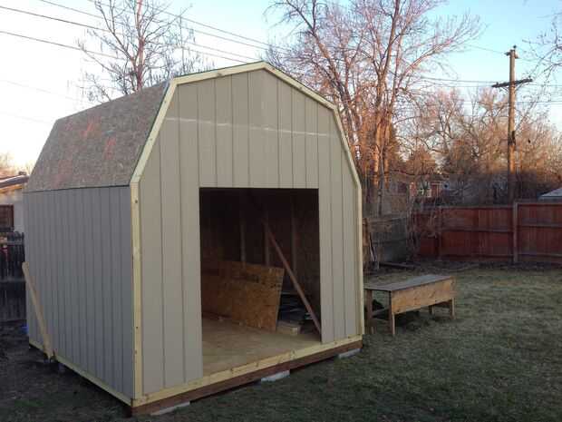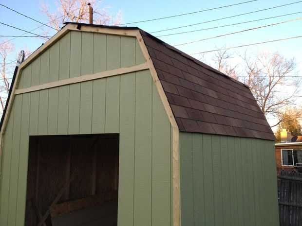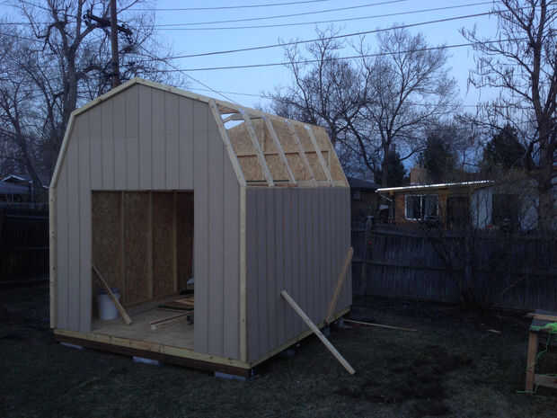 Siguiendo cuidadosamente las instrucciones del kit, enmarcado, paredes, techos y tejas el granero. Tomó mucho más tiempo que el estimado por el kit, cerca de 2 semanas de 2-3 días. Las tejas, las uñas y papel de techo no vienen con el kit. Elegimos las tejas color arena porque parecían como serían las mejores para el verano. Nos encanta cómo resultó. La construcción de esta caseta no era principiante, era un trabajo duro, pero pagará la robustez.