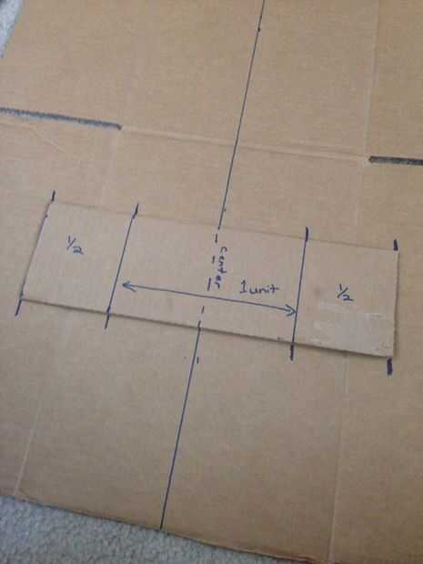 Si usted va la ruta sólo cuchilla de afeitar, corte un pedazo de cinta un equipo largo y dóblalo por la mitad de la unidad de 1/2. Este será el método general para encontrar el centro/centro de piezas de cartón si no tienes una regla o cinta métrica.