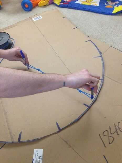 - Dibujar la parte superior medio círculo. Use un pedazo de cinta o cadena para encontrar la media de su pared. Utilice la plantilla para medir 3 unidades hasta el centro de la pared. Use cartulina, cinta o cuerda para mantener su maquinilla de afeitar (o marcador) a distancia del centro de una longitud constante (2.5 unidades). Asegúrese de que su arco intersecten las paredes laterales antes de dibujar. Ajustar la longitud de su "brújula" según sea necesario. Nota: el método de centrado generalmente dará mejores resultados que sólo la plantilla, pero lugares de línea media se deben confirmar con la plantilla siempre que sea posible.