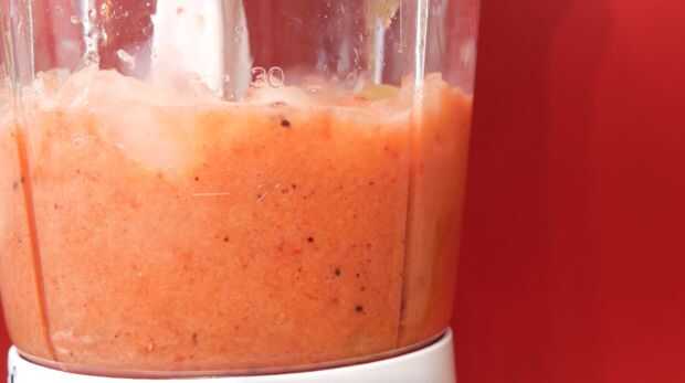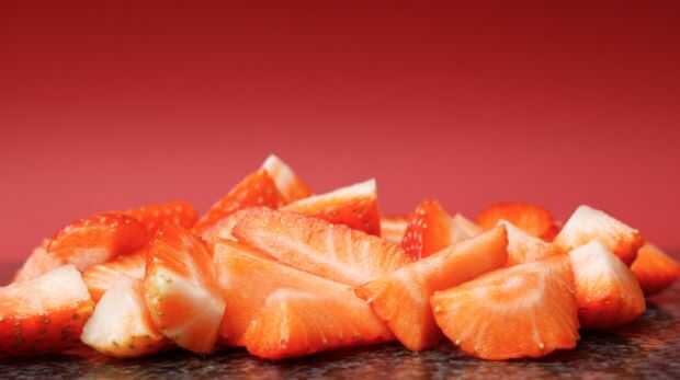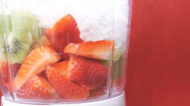 Picar las fresas y kiwis. Coloque la fruta y el hielo en una licuadora y licúe hasta que todo quede homogéneo. Agregar el limón amargo y mezclar otra vez.