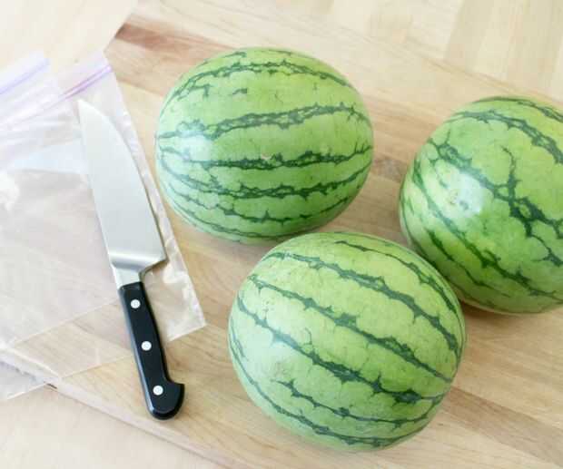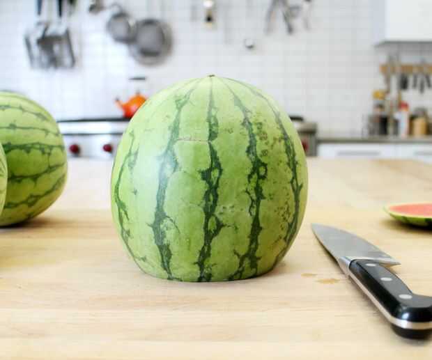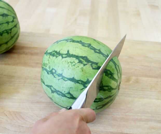 Cortar una rodaja plana agradable fuera de la parte inferior de cada sandía, para que pueda sentarse erguido con mucha estabilidad.