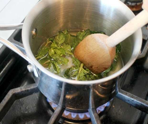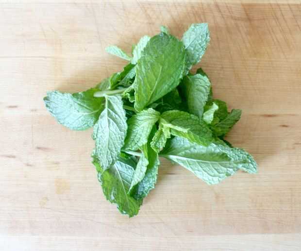 Tomar 1/3 de su manojo de menta fresca, lavada y retire las hojas de los tallos.