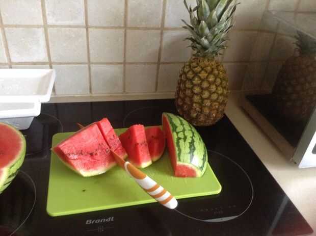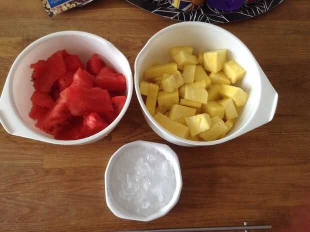 Comienzo cortando las frutas en trozos pequeños, fáciles de mezclar en el procesador licuadora o alimentos. Eliminar la mayor parte de las semillas de sandía, (opcionales). Mezcla de la seperatelly de frutas junto con poco de hielo triturado.