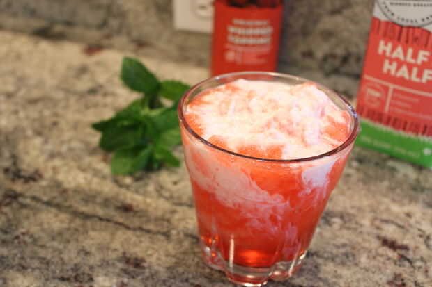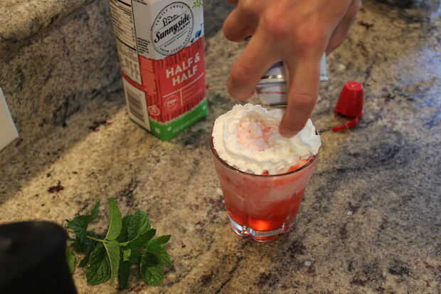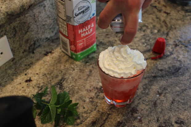 Ahora Vierta el silencio en un vaso. Distribuya uniformemente 1 T de mitad y mitad y luego rematar con un remolino de crema batida. Ahora final de nuestra obra maestra con unas hojas de menta.