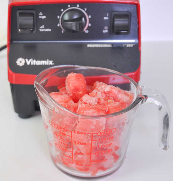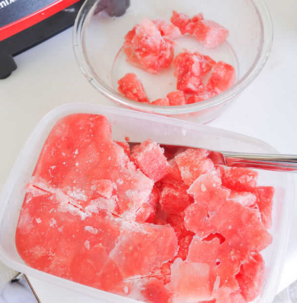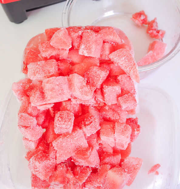 Lo que debes hacer. Cortar la sandía en cubos para mezclar más fácil. Poner sus cubos en una bolsa de ziploc galón. Trate de evitar cualquier exceso de agua o jugo en la bolsa. Pega esto en el congelador hasta que esté congelados (sólo dejé toda la noche).