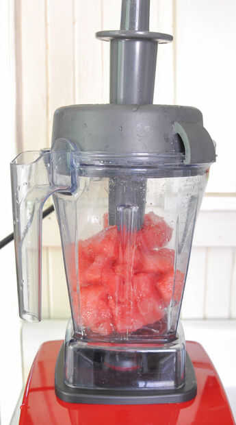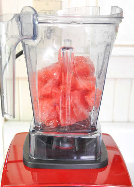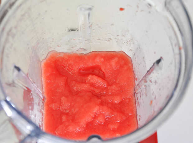 Poner la sandía congelada en trozos y el jugo de sandía en la licuadora. Puede que necesite más o menos jugo. Quisiera decir para empezar con un poco y añadir más como usted necesita. Sólo está agregando en ayudar en la mezcla.