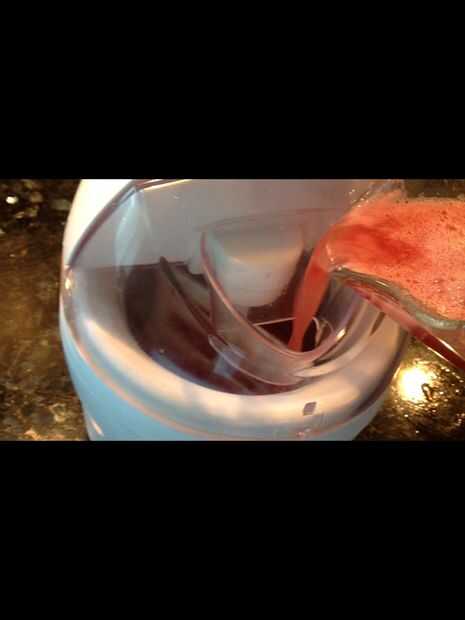 1. Agregue la mezcla de sandía a tu heladora y siga las instrucciones de la máquina. Debería tomar aproximadamente 20 minutos para empezar a ver pequeños trozos de sandía hielo. Después de 30 minutos la mezcla entera debe tener una consistencia de granizado como en la tercera foto.