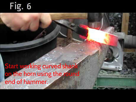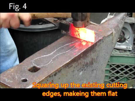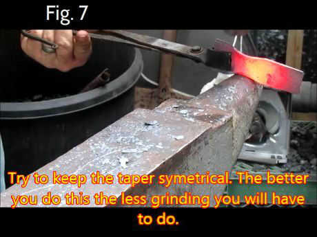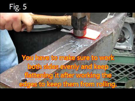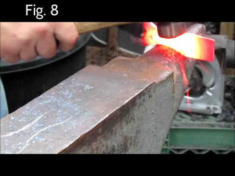 He encontrado que forja en un calor anaranjado/amarillo (Fig. 4). Una vez que observa el enfriamiento del acero debe parar y poner de nuevo en la fragua. Está bien suave aplane hacia fuera con unos golpes ligeros, o enderezar slightbends a fuego negro. Pero tenga mucho cuidado porque puede romper el acero o dañar sus herramientas.