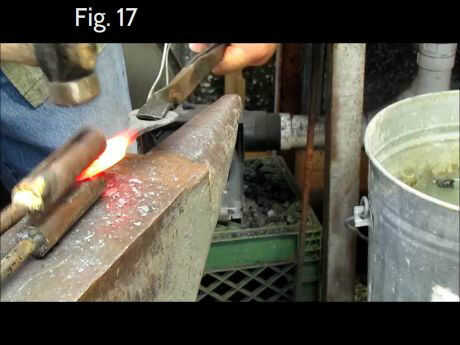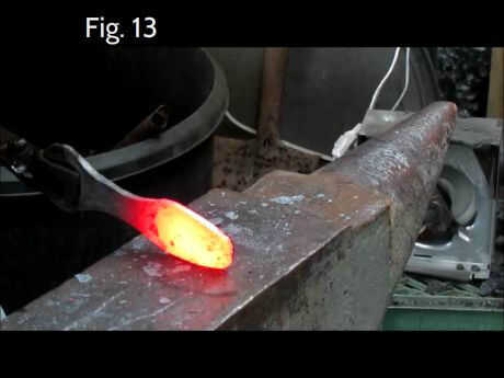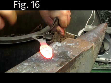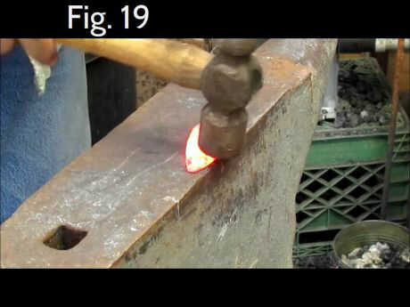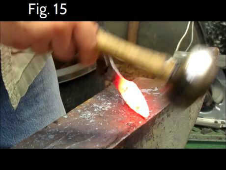 Una vez que las esquinas redondeadas con eficacia, puede empezar disminuyendo el punto (Fig.13). Principalmente se utilice el lado liso del martillo para esto. Sostener la pieza en ángulo sobre el yunque y ángulo de la cara del martillo que golpee así. Como se desarrolla el punto de mover la pieza a la orilla del yunque, pero no sobre ella (Fig. 14-15). Mientras que el sorprendente que parte de la caída del martillo sobre el borde del yunque con golpes de refilón. Esto le permitirá obtener un trazo fino con cabo golpeando el yunque con su hammer(Fig.15-16).