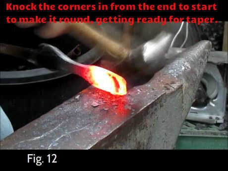 Para llegar hasta el extremo cuadrado a un punto afilado debe primero golpear las esquinas hacia la hoja y hacer el final en una forma redonda u ovalada (Fig. 12). Para ello el material de la oscilación del extremo hacia usted y el ángulo del martillo entre cada ataque giratorio.
