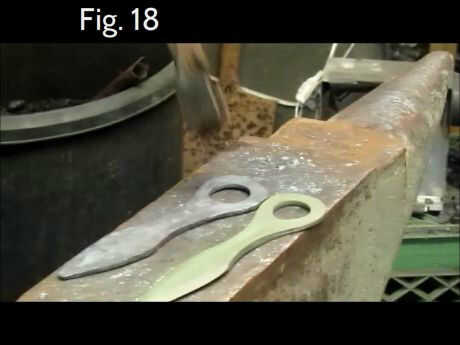 En la figura 17 estaba usando una herramienta llamada una herramienta más completa de la primavera para poner una pequeña curva cóncava frente a la hoja llamada una fuller. En este tamaño de hoja es principalmente para la estética, pero en espadas y cuchillas más grandes proporciona fuerza adicional si se hace correctamente.