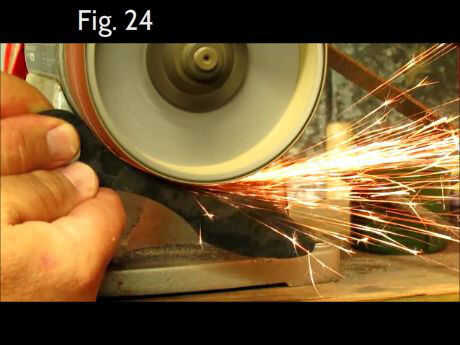 Como con la forja, la simetría es clave para este estilo de cuchillo. Moler un poco un lado y luego darle la vuelta y moler el otro. Mirarlo y sentirse de la misma (después de refrescarse en el agua) constantemente para asegurarse de que se quite material donde usted quiere, una vez que su desaparecido no se lo pones de nuevo. Simplemente tome su tiempo. Agua de enfriamiento es imprescindible para que pueda sostenerla.