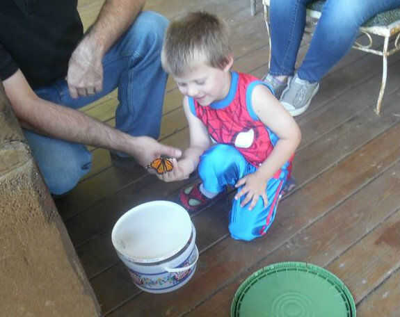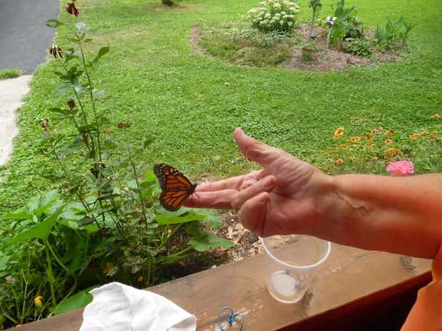 A veces las hojas mariposa inmediatamente y a veces se mantendrá en sus dedos durante unos segundos. Nuestro nieto estaba allí cuando sacamos nuestras primer dos mariposas. Por desgracia, voló enseguida. Él fue capaz de sostener la mariposa herida. Yo creo que es la razón de que nuestro hijo planea planta algodoncillo el año próximo. Nuestros vecinos también se acercaron y tomaron un video de un comunicado.
