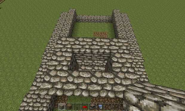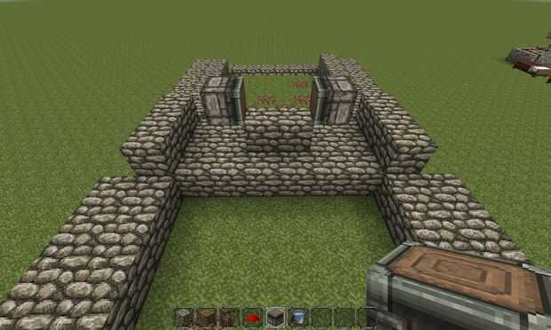 construir el centro, entre las dos plataformas de tierra. lugar altura bloque de 1 x 2 en el centro. colocar los pistones en ambos lados cara a in lugar pared a lo largo del borde. construir un rectángulo de 3 x 4 por encima de los pistones con un centro hueco