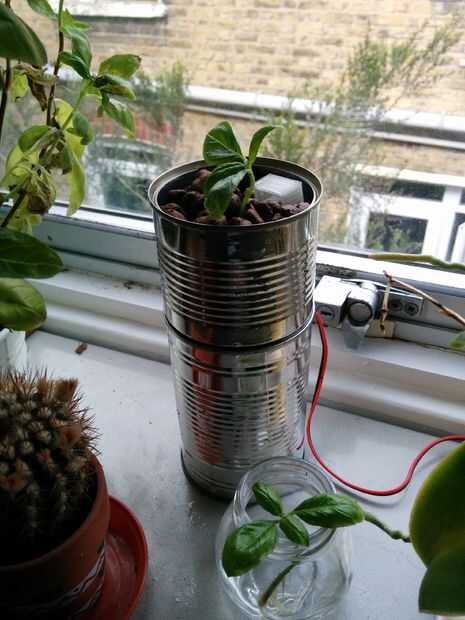 Mini granja hidropónica hace de un par de latas de lata y una bomba sumergible de DC, controlado por un Raspberry Pi.