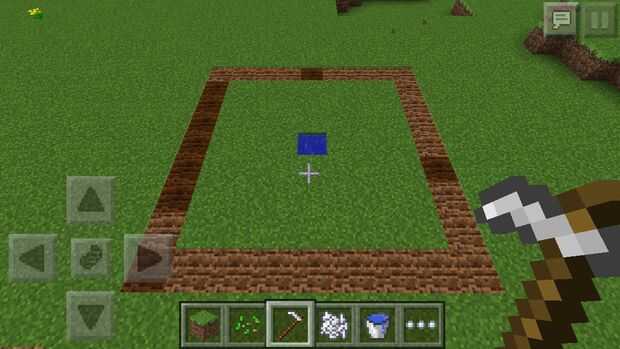 En primer lugar, hacer un área 9 x 9, he esbozado mi área de trabajo sobre el terreno la hierba. Luego empuje el bloque medio y rellenar con agua.