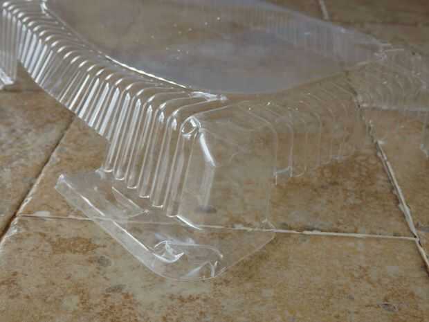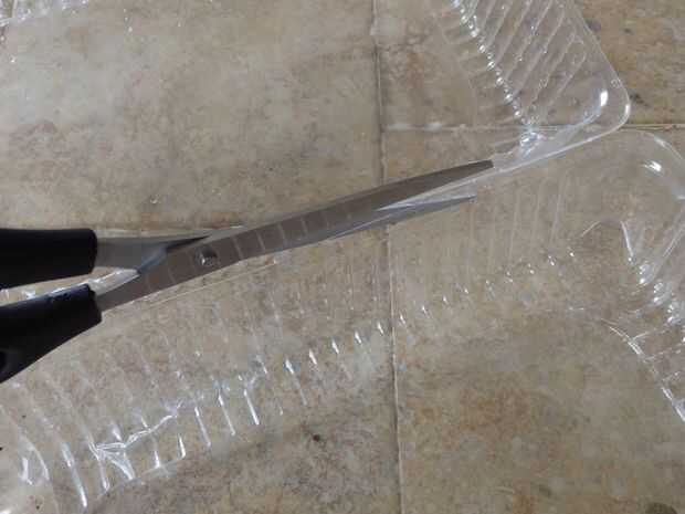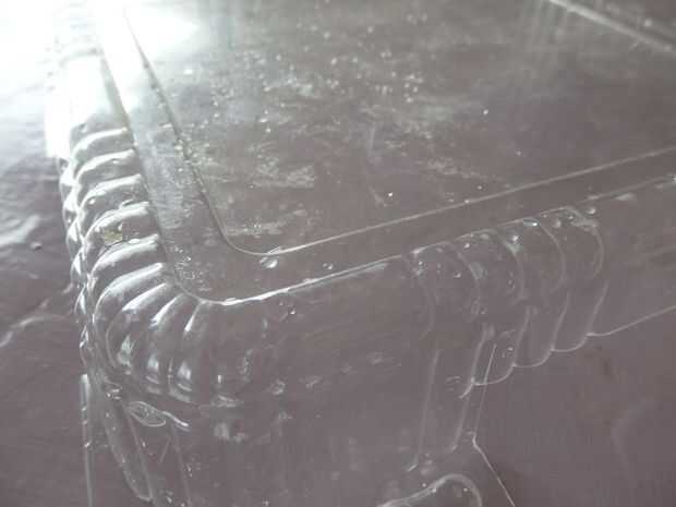 - Salir de dos recipientes de plástico como los usados para donas (ver foto). Deben ser unos 4" alto, abertura en el medio para producir dos mitades 2". Idealmente, usted quiere la parte central para biselar, para que cuando se colocan con las paredes hacia abajo como una tabla, la parte central sumerge hacia abajo para proporcionar un pequeño borde alrededor del borde.