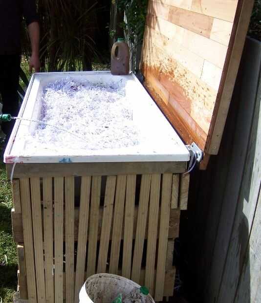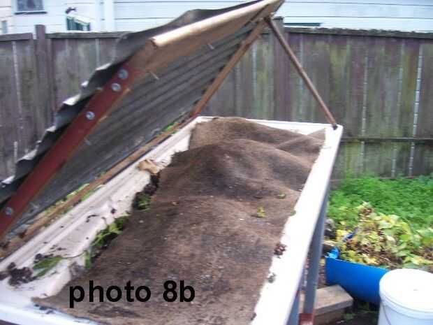 - La primera granja construí utilicé una tapa de cajón de madera, y cuando que se pudrieron a reemplazó con uno que hice con madera y una hoja de hierro de la cubierta, con bisagras en un lado (foto al lado de la casa verde)