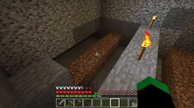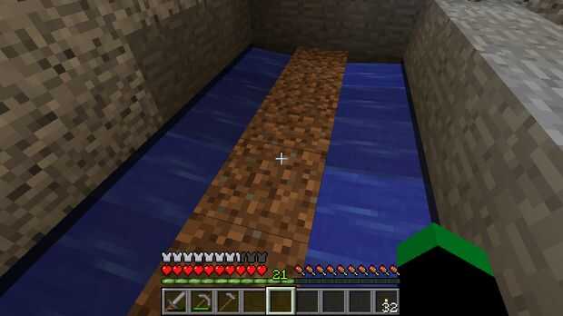 Usted puede hacer esta granja tiene muchos niveles para tener cosechas más por cosecha. Después de cada 5 cuadras de tierra, debe dejar caer uno por lo que el agua pueda fluir a través de todo. El agua sólo puede propagarse a través de 6 cuadras, y queremos la 6 al caer sobre el borde del siguiente nivel por lo que puede cosechar otro 15 bloques de alimentos. Como haces como escaleras y cada paso está a 5 manzanas de largo y una altura, el agua se moverá a través de ellas y caer a través del hacen al final.