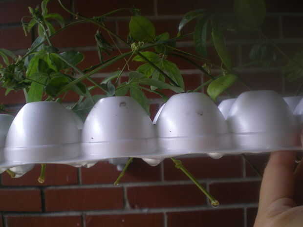 Cuando se utiliza la parte inferior de la caja de cartón de huevo, creo que funciona bien para vides y más recortes al revés. Lado derecho hacia arriba permite demasiada agua en las tazas y la putrefacción de las plantas. Poner un agujero en la parte superior de cada golpe, igual que el último paso.