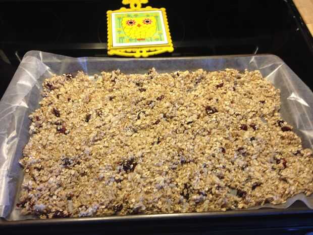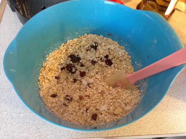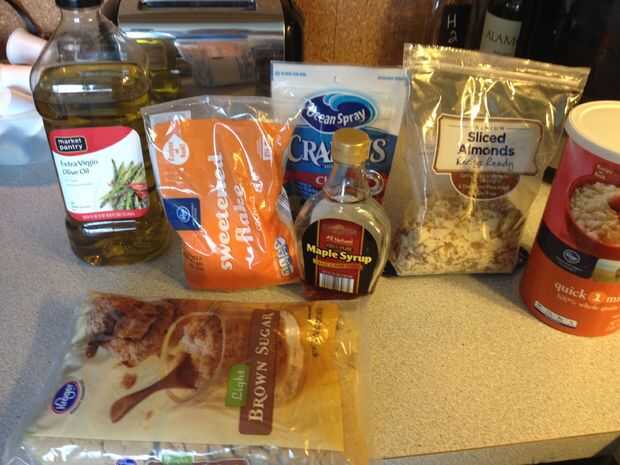 Todos sus ingredientes secos en un bol mezclar: avena, coco, azúcar morena, arándanos, almendras o cualquier tipo de guarniciones que quiera. En otro tazón bate aceite de oliva y jarabe de arce (combo raro, correcto?). Poco a poco salpicar aceite de oliva y jarabe de arce combinado sobre la mezcla seca. Remover y verter sobre una placa para horno forrada pergamino. Hornear durante 1 hora, revolviendo cada 15 minutos.