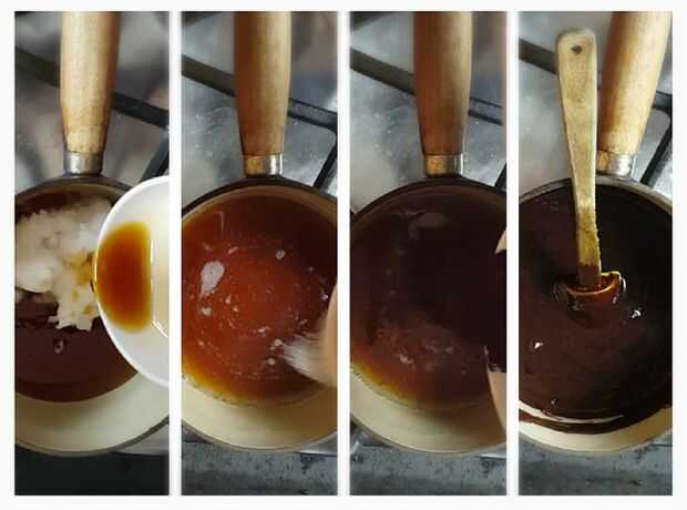 Derretir el aceite de coco, jarabe de arce y extracto de vainilla en una cacerola pequeña. A continuación añadir la sal y cacao en polvo y batir hasta que quede suave.