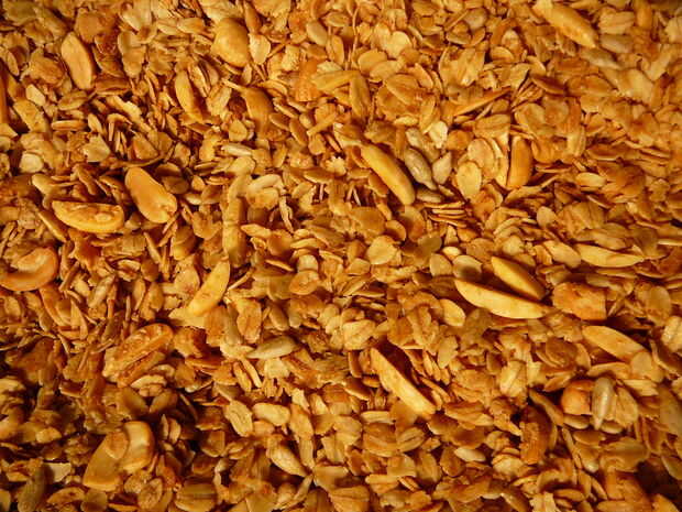 Granola toma avena aburrido llano como su base y lo convierte en un alimento que sacia la mayoría de nuestros grandes sensaciones. Granola bien hecho es difícil dejar de mordisquear en el. Servido con fruta fresca y yogur hace un nutritivo desayuno que es fácil de preparar pero que funciona en algunos centros básicos de placer en el cerebro, sal, dulces, grasa, crunch, necesita un poco autocontrol para dejar de comerla!