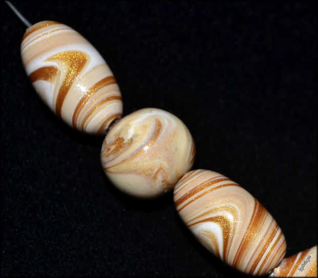 Para hacer estas cuentas, había condicionado todos los colores de la arcilla primero capas en un bloque. Yo rodé moderadamente finas capas de oro, crema y arcilla translúcida, luego puso una encima de otra y había presionado firmemente juntos.