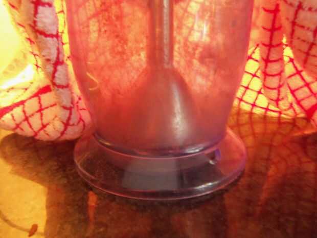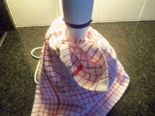 Tomar lo que desea para granulado y colocarlo en un tupperware o recipiente adjunto hoja de lugar (ver foto 1) en la licuadora y coloque un licuadora sustancia y luego cubierta con el paño del plato (el primer pic) esto es para que no polvo del aerosol todo.