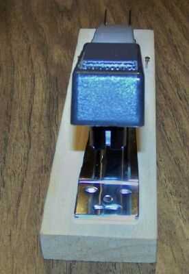 Este es mi grapadora de largo alcance desde el extremo delantero. Hay sólo un pequeño juego en el perno del eje en la parte posterior de la grapadora. A veces resulta una grapa mal doblada que necesito quitar y hacer. Sin embargo, si aplica un poco de inglés o empujar hacia el lado izquierdo de la foto de la grapadora, funciona bien cada vez.