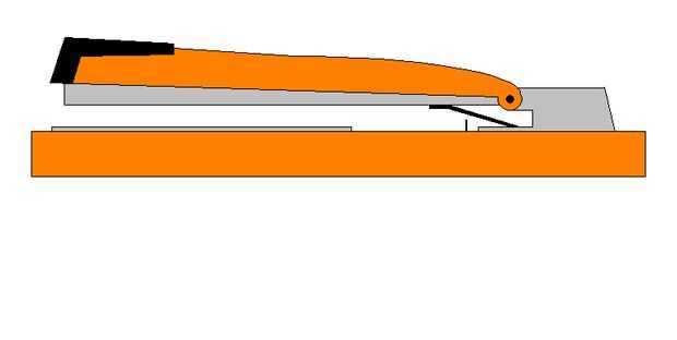 Aquí puedes ver la primavera que devuelve la grapadora a su posición hacia arriba (línea pesada negra cerca del eje). Cerca de la primavera se puede ver una línea negra vertical de la base de madera. Este es uno de dos broches de alambre para actuar como un tope cuando inserta el papel para grapar en el pliegue de un folleto. Establecer un brad de alambre en ambos los lados izquierdo y derecho de la grapadora.